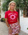 Het rode T-shirt gecombineerd met roze en geel in het design straalt één en al warmte uit.