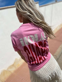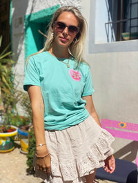 Het model is 177 cm en draagt maat S. De items vallen van zichzelf loose fit dus als je twijfelt tussen 2 maten kun je voor de kleinste gaan voor een meer aangesloten effect of je eigen maat voor een loose fit lookje. Wat ook super leuk is voor de zomer is het T-shirt extra groot te kiezen en te combineren met een shortje eronder voor de perfecte festival look.