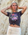 Ondergaande zon, palmbomen en een jeep. Deze print met lila accenten is mega leuk op ons smokegrey T-shirt en lekker makkelijk te combineren met heel veel wat je in je kast hebt hangen.